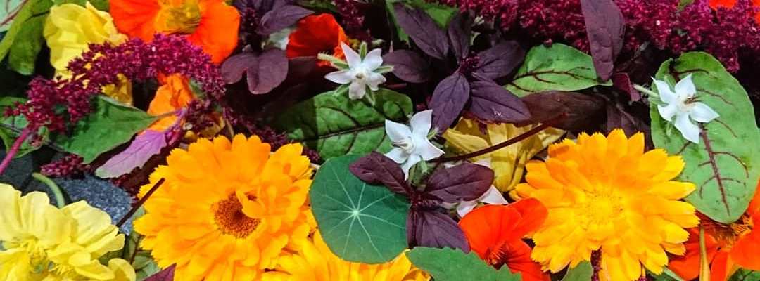 Our range includes Borage, Viola, Cornflower, Nasturtium, Calendula, Coriander, Chive, Rocket, Mustard, Amaranth Red, Primrose, Honey Suckle, Dahlias, and Brassica flowers. That’s just a sample of the flowers available, which varies month to month and season to season.